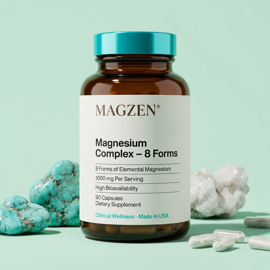 Our Magnesium Complex Spectrum 8 uses exclusively highly bioavailable chelated forms, specially selected to be gentle on the stomach. Unlike cheap forms (such as magnesium oxide), our premium forms generally do not cause unwanted digestive effects. In rare cases, some people may experience mild drowsiness at the beginning of the course — a sign that your nervous system is finally relaxing. If you experience any discomfort, simply reduce the dose for a few days, then gradually increase it again.