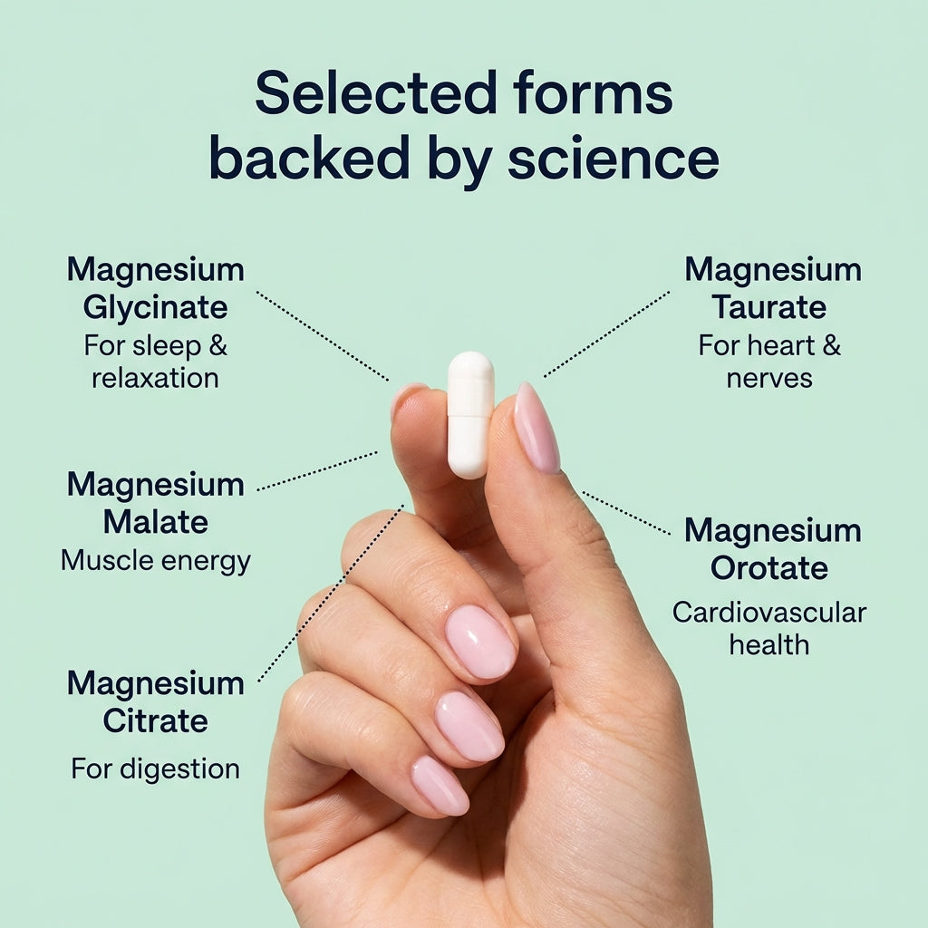 Magnesium is an essential mineral naturally found in food and is generally well tolerated. However, if you are taking prescription medications (particularly antibiotics, diuretics, or osteoporosis treatments), we recommend consulting your doctor or pharmacist before starting any supplementation. Our formula uses highly bioavailable forms of magnesium that are gentle on the stomach, specifically chosen for their excellent tolerability. If in doubt, your healthcare professional can advise you on the best time to take it to avoid any interactions.